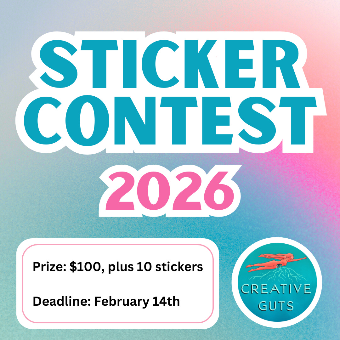 Creative Guts is hosting our second annual contest for a creative sticker design in early 2026! The winning design will be made into a sticker that will be shared with the Creative Guts community. The winner will be paid $100 for use of their artwork, plus 10 complimentary stickers.